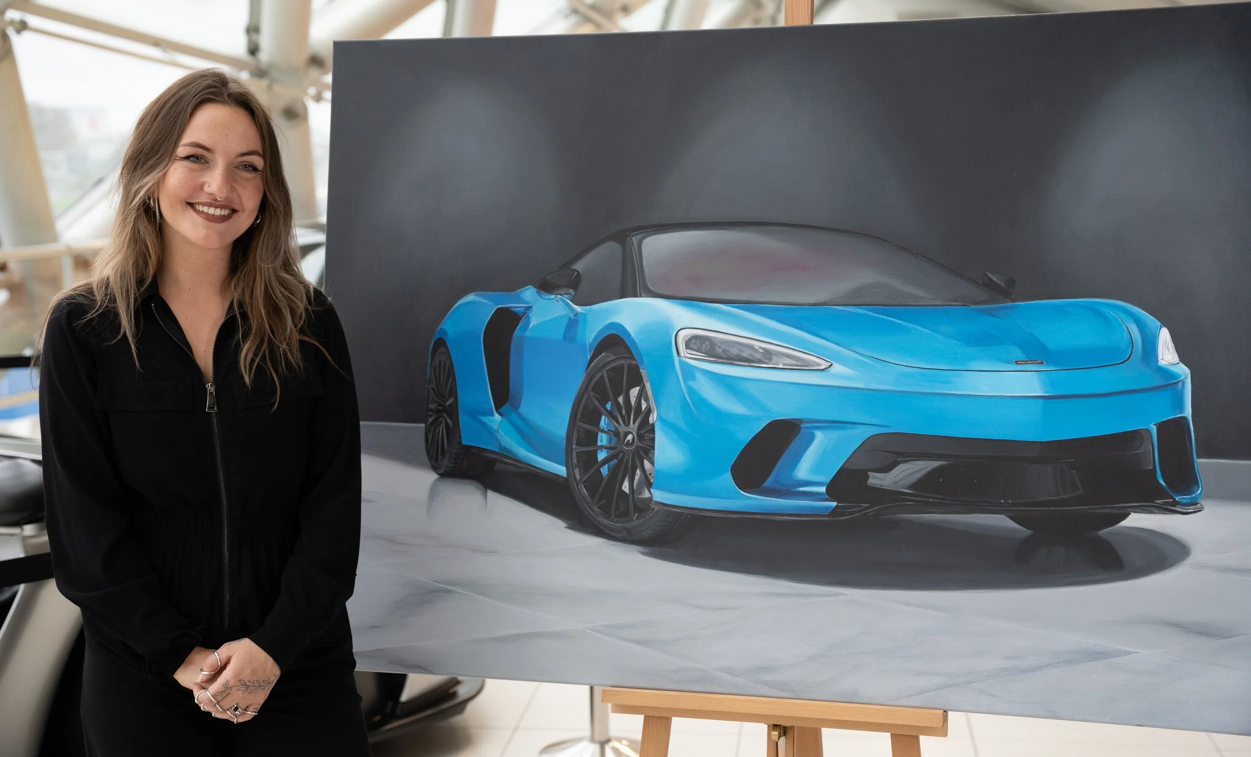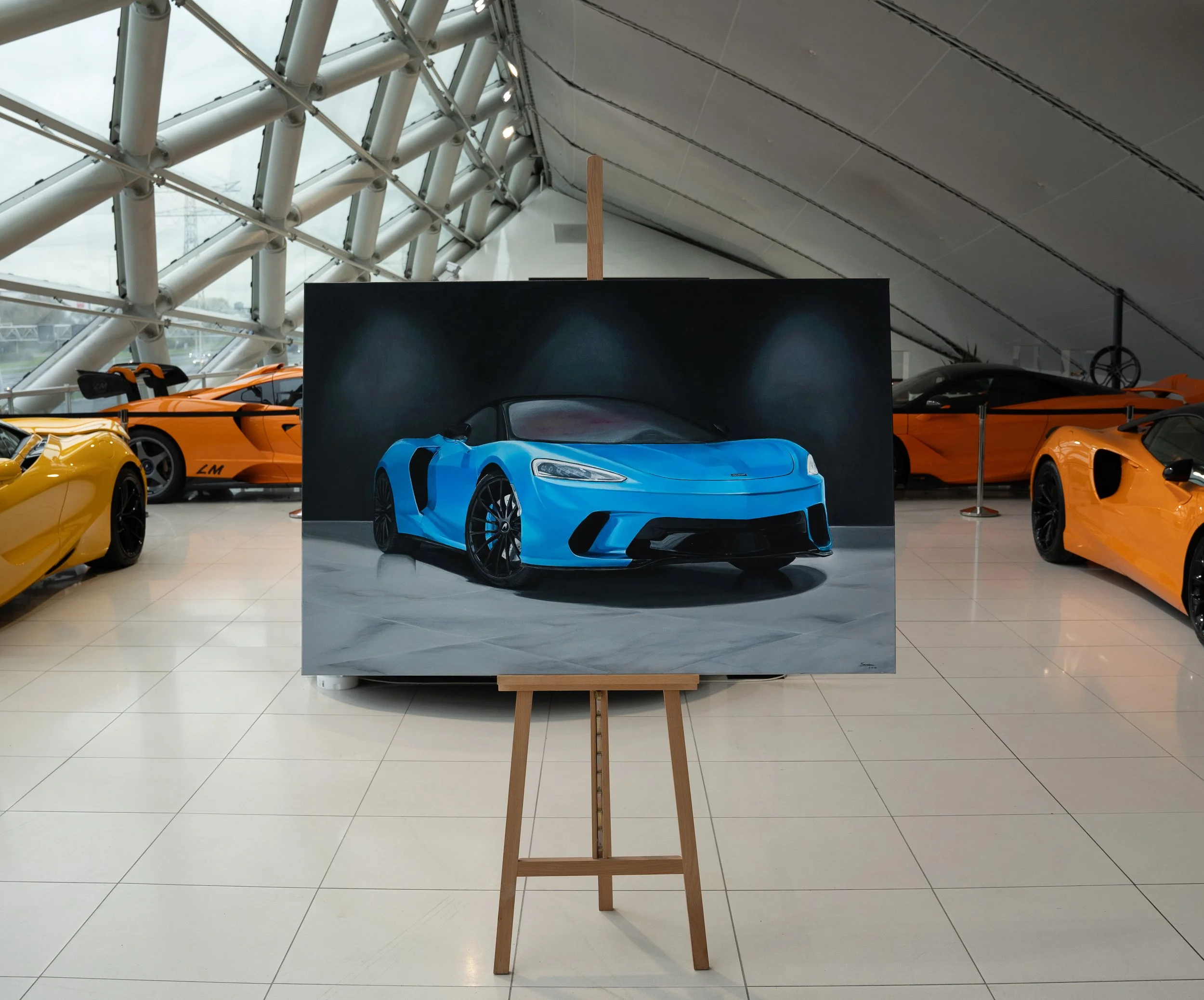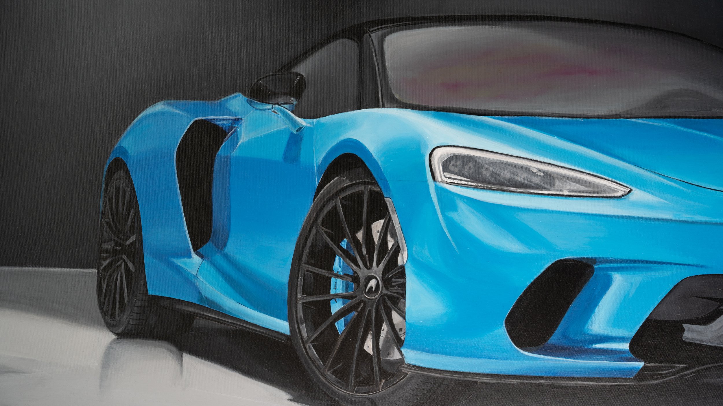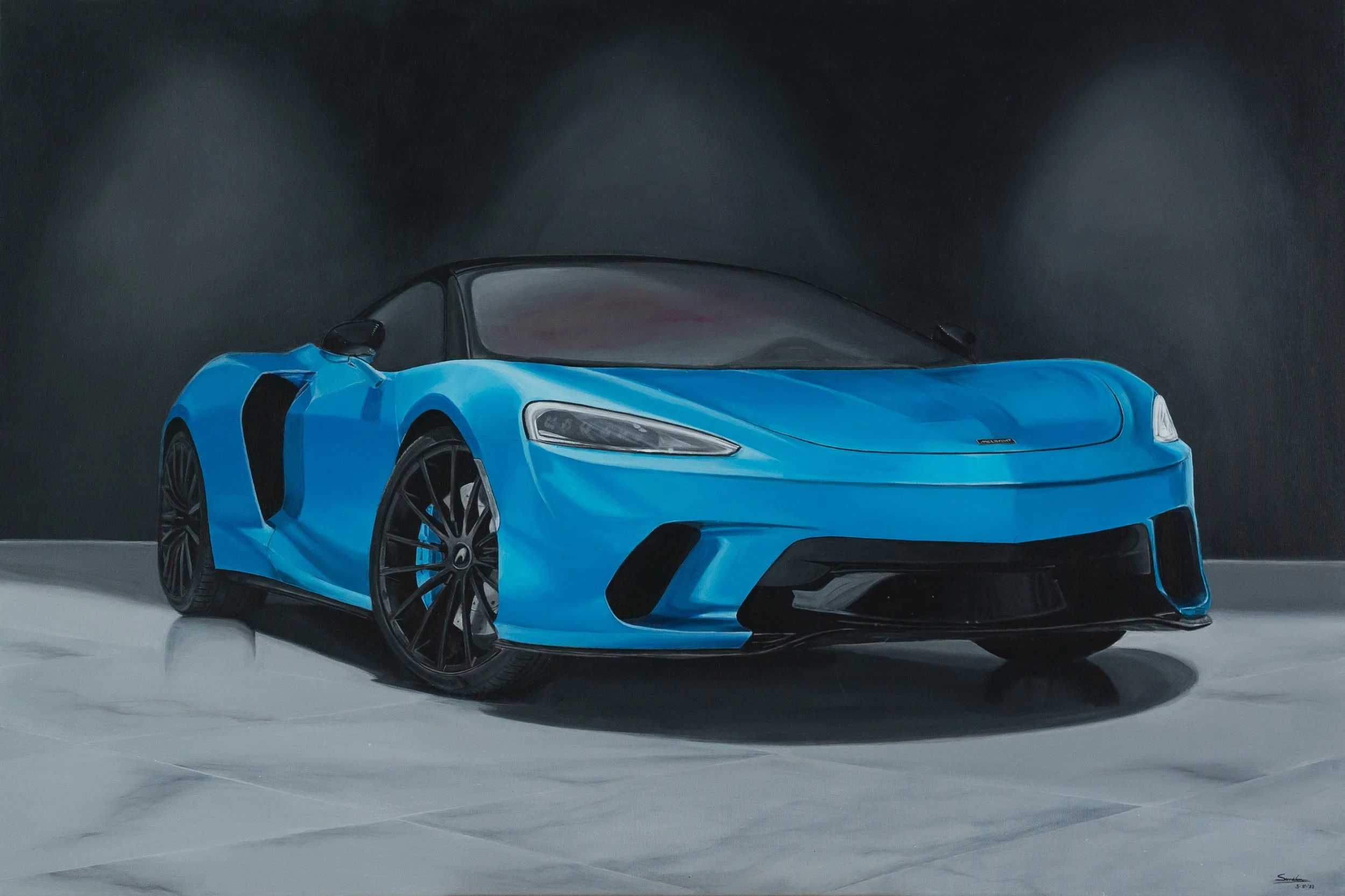Op het doek straalt de McLaren GT 4.0 V8 in een betoverend blauw-groen parelmoer. Elk detail van de auto is met precisie vastgelegd, de kleur veranderend met elke lichtinval. De achtergrond dient als een bescheiden podium, waardoor de majestueuze aanwezigheid van de McLaren nog meer opvalt. Het schilderij is een ode aan de technische pracht van de auto en de kunst van kleur en licht, waar toeschouwers worden uitgenodigd om de subtiliteiten van het parelmoer te verkennen en zich te verliezen in de tijdloze elegantie van deze sportwagen.