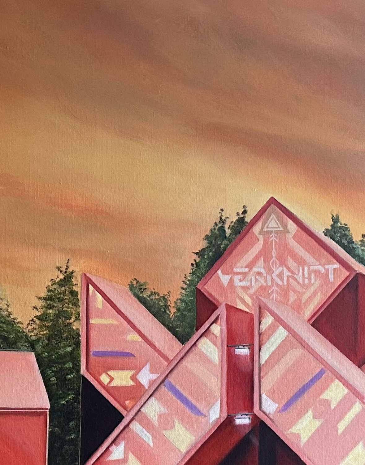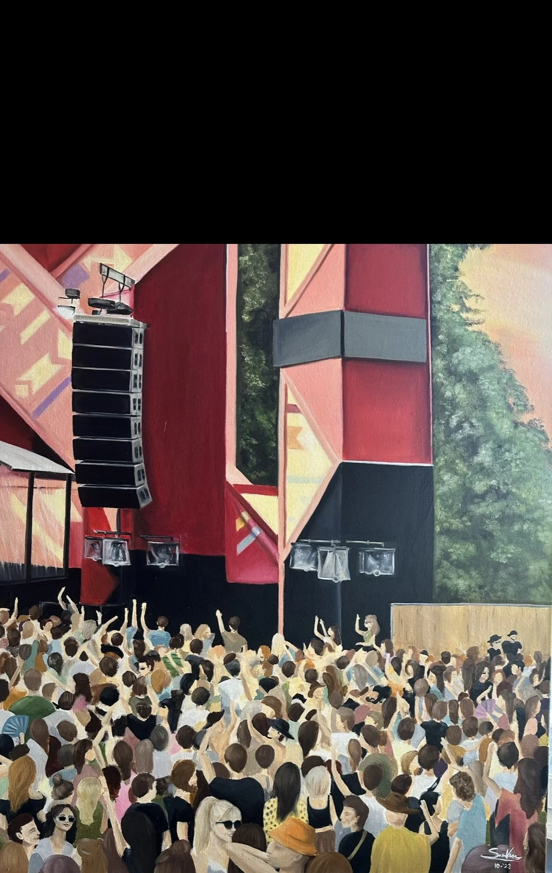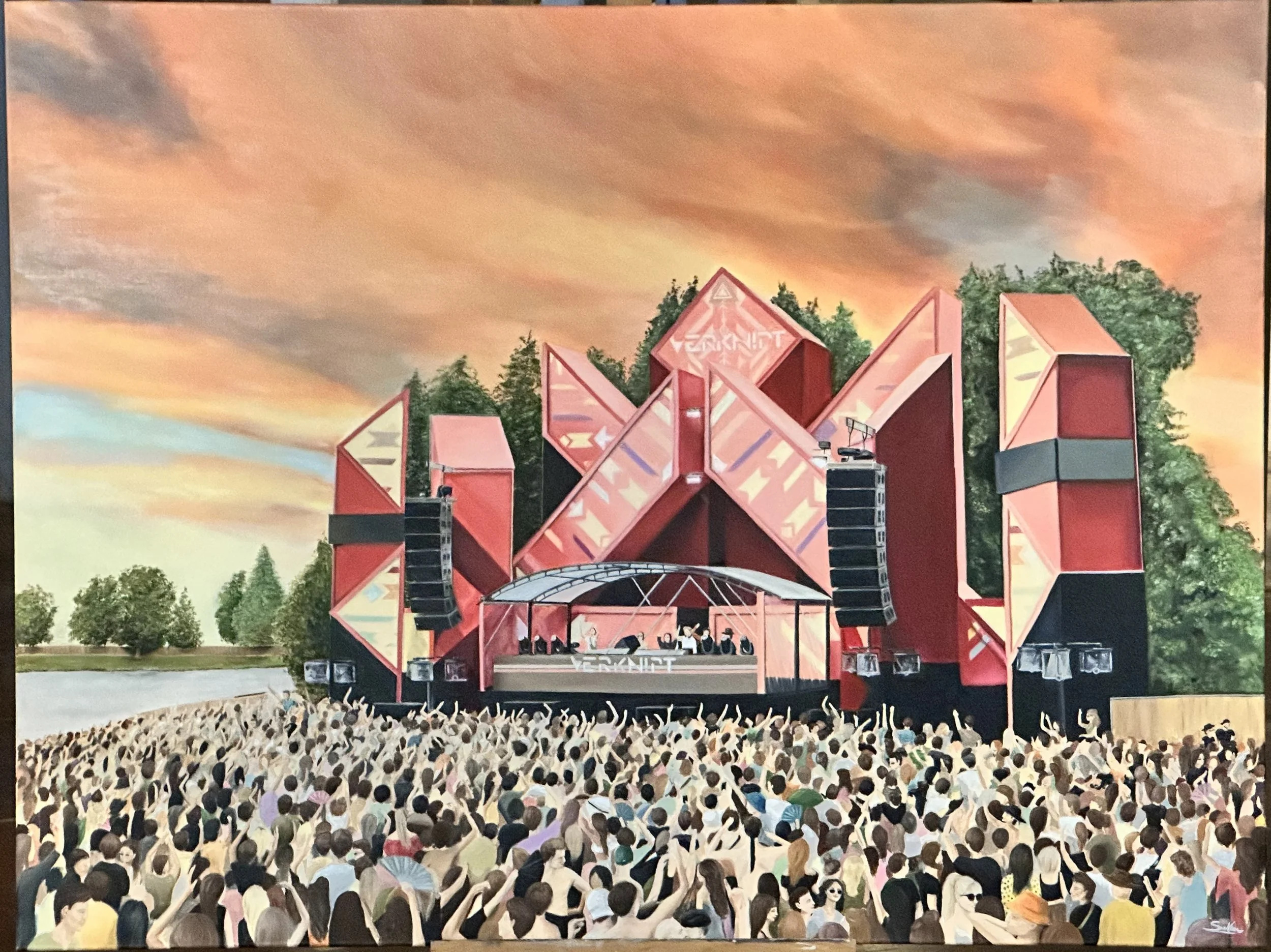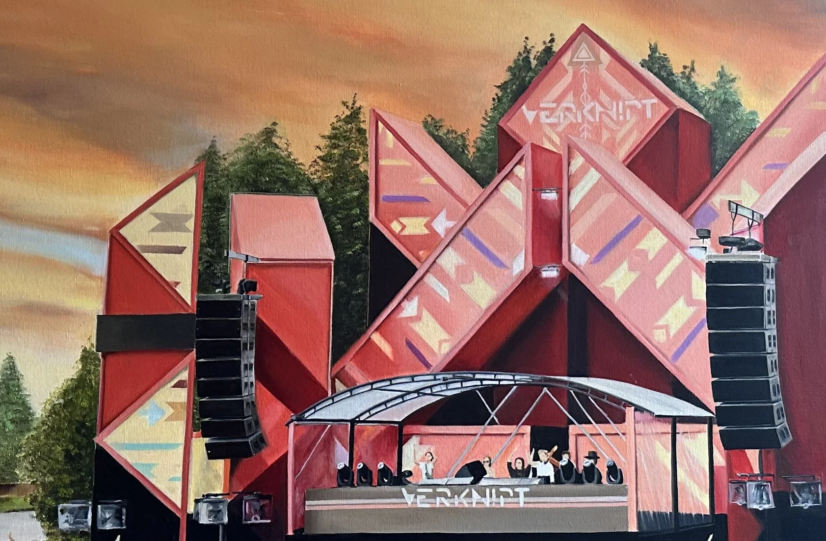 Dit schilderij heb ik in opdracht gemaakt voor Verknipt. Het was erg leuk om mezelf in het diepe te gooien en iets compleet nieuws te maken, namelijk de mainstage van het Verknipt festival in 2021.